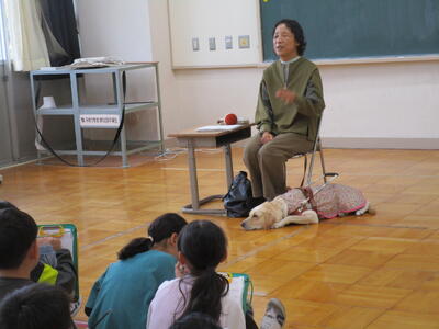 今日は、4年生が福祉体験として盲導犬について教えていただきました。