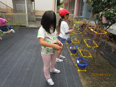 休み時間に、1年生が育てているアサガオの種をとりました。