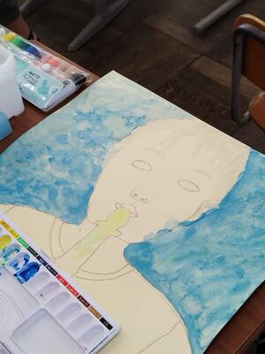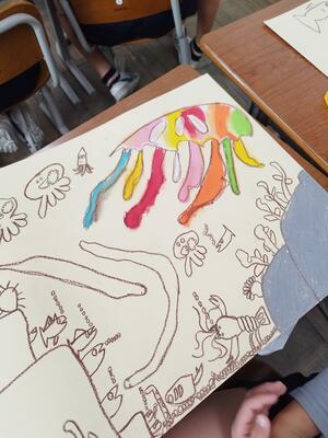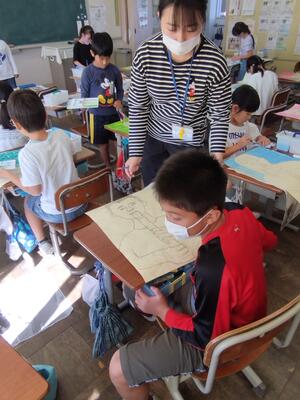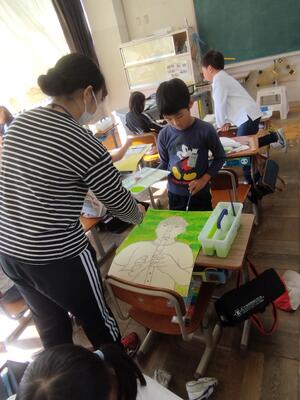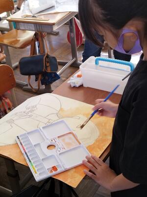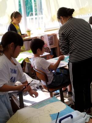2年生が、図工でお話の絵を描いています。「スイミー」や「かさこ地蔵」等、好きなお話を選びました。