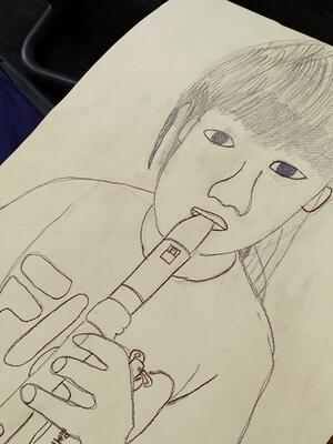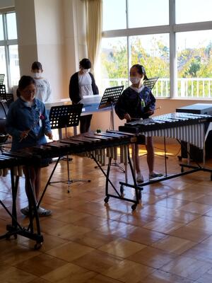 合奏団の児童が発表曲「名探偵コナン」メインテーマを練習しています。