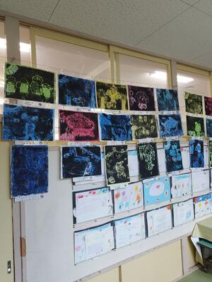 2年生は、好きな色の台紙を自分で選び、紙版画を印刷しました。