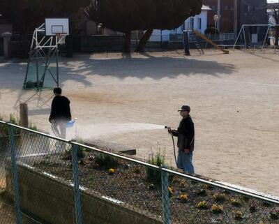 人権福祉委員会の児童が花壇のパンジーに水をかけています。