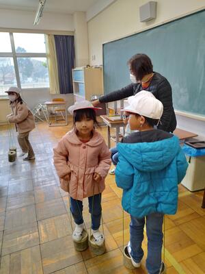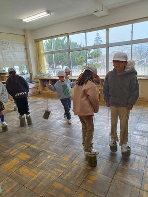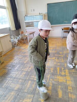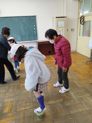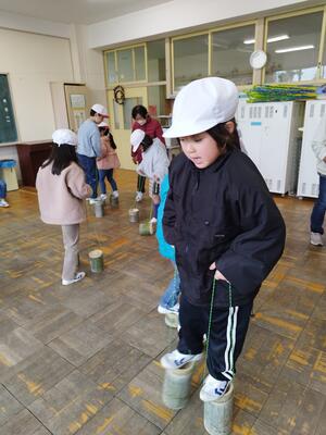 フレッシュわかあゆタイムに、1年生が竹ポックリを練習しています。