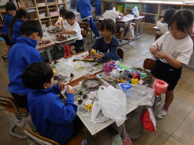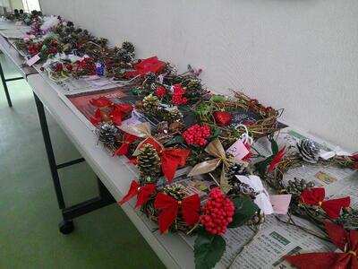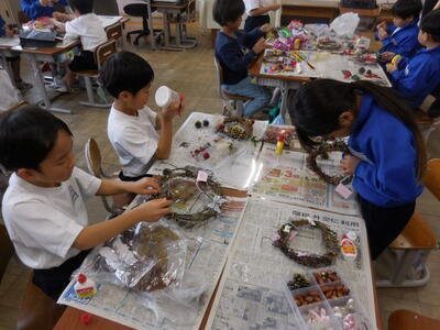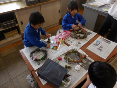 すてきなクリスマスリースができました 投稿: 承認者 (19:18) 今日は、1年生が、アサガオのツルでつくったリースにドングリや松ぼっくりを飾って すてきなクリスマスリースをつくることができました。 赤いリボンや赤い実が、クリスマスらしい雰囲気を出しています。 Tweet -