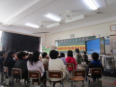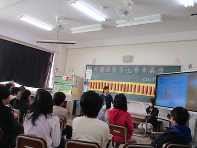 昨日は、2年生が1年生に調べたことを新聞にまとめて発表し、今日は、1年生が2年生に調べたことを