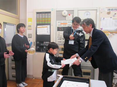 表彰がありました 投稿: 承認者 (20:41) 今日は、給食の時間に表彰がありました。 スポーツや習字、絵画、読書感想文でがんばった児童の表彰でした。 放送での表彰でしたが、教室から大きな拍手が聞こえてきました。 みんなの拍手を聞いて、表彰者もうれしそうでした。 Tweet -