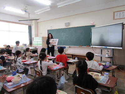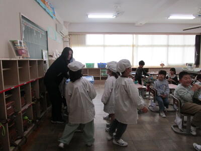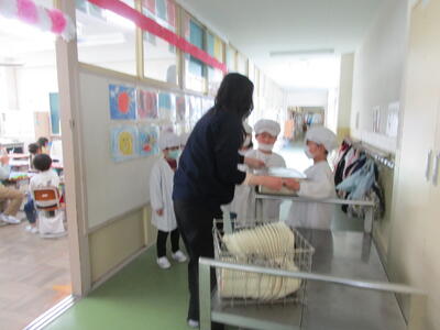 その後、給食当番が白衣に着替える練習をしたり、みんなで給食の配膳の仕方や